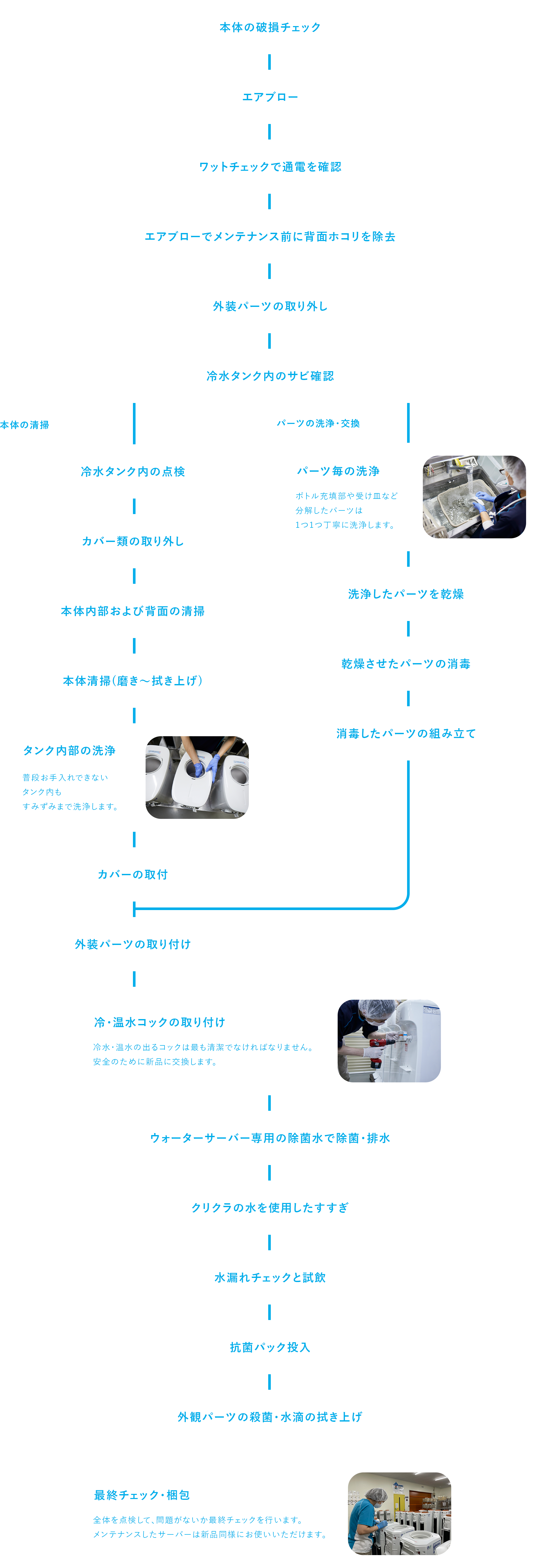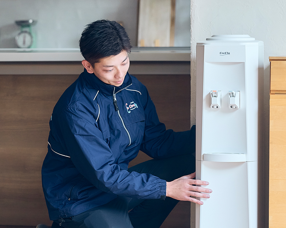 それは「お届けする水の品質を維持するためには、サーバー本体の衛生管理も不可欠である」という強い思いから。20年以上にわたり、安全でおいしいお水を提供し続けてきたクリクラの「安心・安全」に対する徹底した姿勢がここにあります。