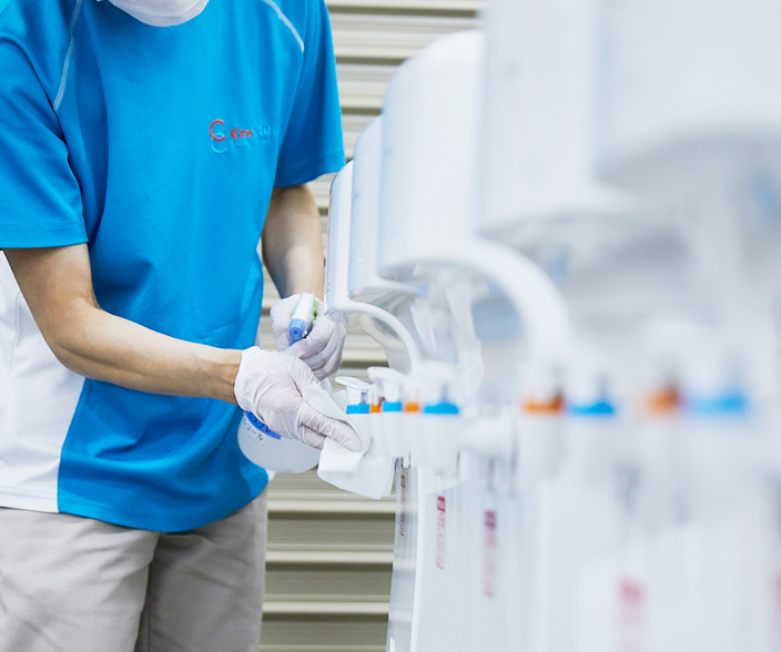 ボトルの差し込み口から外から見えない内部まで分解し、1台ずつ、丁寧に徹底洗浄・殺菌しています。